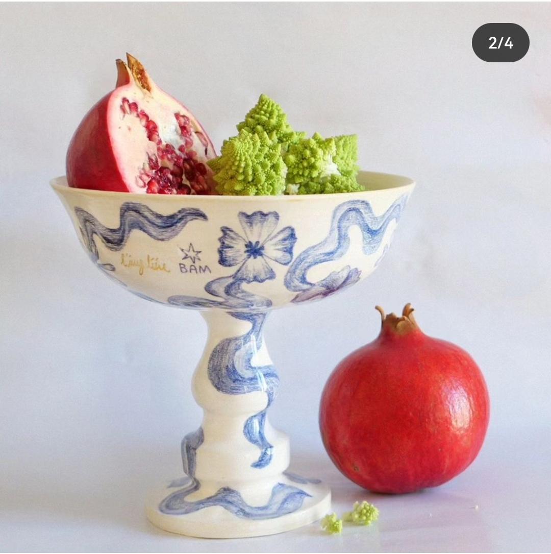 Coupe en faïence blanche et décoré par Bam studio à l'oxyde de cobalt